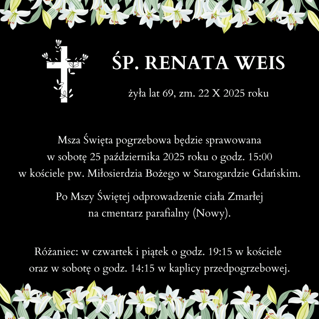 Uroczystości pogrzebowe odbędą się w sobotę, 25 października, o godz. 15:00 w kościele pw. Miłosierdzia Bożego w Starogardzie Gdańskim (po Mszy odprowadzenie na cmentarz parafialny – Nowy).